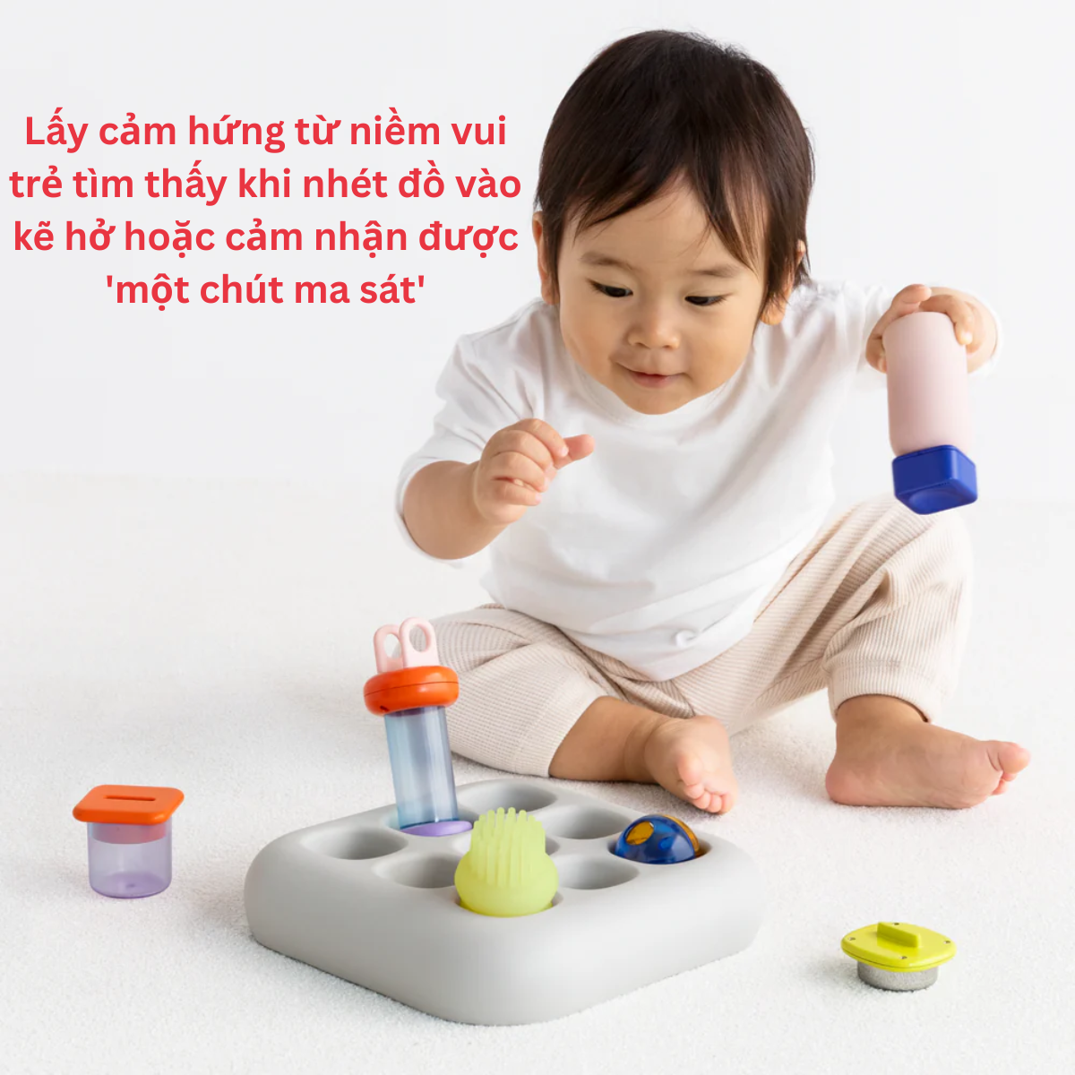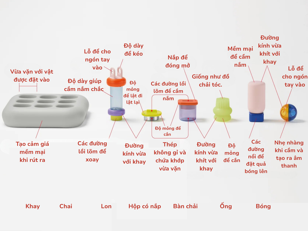 - Khi bé tương tác với đồ chơi, các ngón tay sẽ được sử dụng linh hoạt để kéo, lắp và cảm nhận độ mềm và cứng của từng chi tiết. Sự khác biệt về chất liệu và âm thanh khi chạm vào giúp bé học cách phân biệt cảm giác và hình dạng.