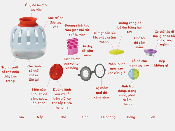 - Khi bé chơi với món đồ này, bé được khám phá từng món một, từ cảm nhận chất liệu, quan sát hình dáng đến lắc, ngậm hoặc đặt lại vào giỏ. Quá trình đó giúp bé phát triển kỹ năng phân loại, nhận biết và tăng cường trí nhớ.
