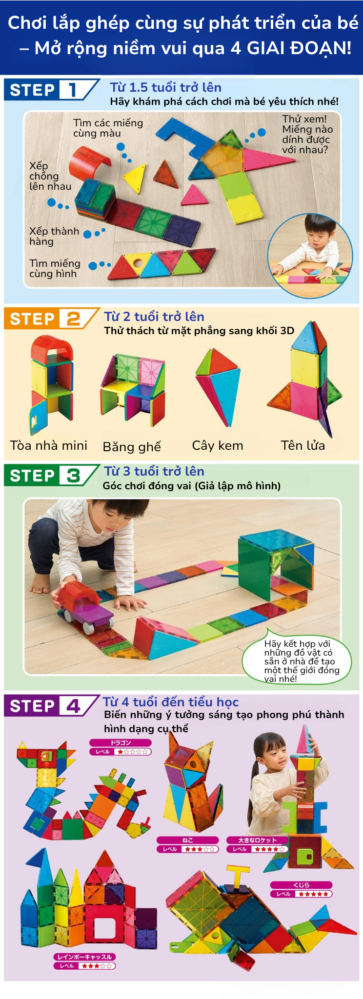 - Có nam châm ẩn để những mảnh ghép không bị di chuyển, Nam châm gắn kết xếp khối một cách dễ dàng