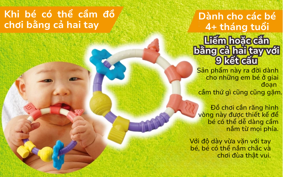 Giai đoạn 3 tháng tuổi: đây là thời điểm bé thích thú khám phá thế giới xung quanh, đặc biệt bằng cách cắn, ngậm, nhai, liếm, bú đồ chơi của mình. Vòng ngậm nướu Two Hands Teething Ring với trọng lượng nhẹ có thể cầm bằng một hoặc 2 tay, giúp bé khám phá, cảm nhận sự khác biệt của mỗi kiểu bề mặt khác nhau trên vòng, từ đó phát triển các giác quan, kích thích nhận thức.